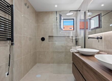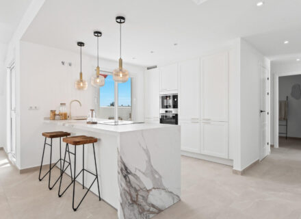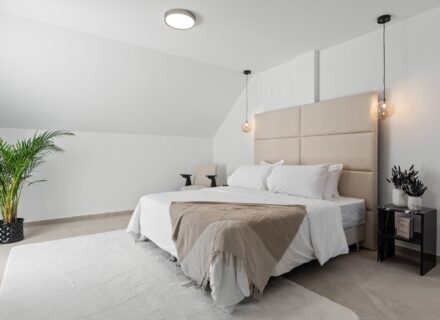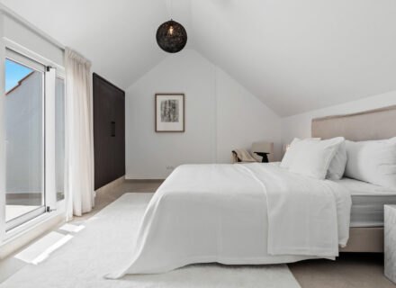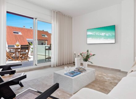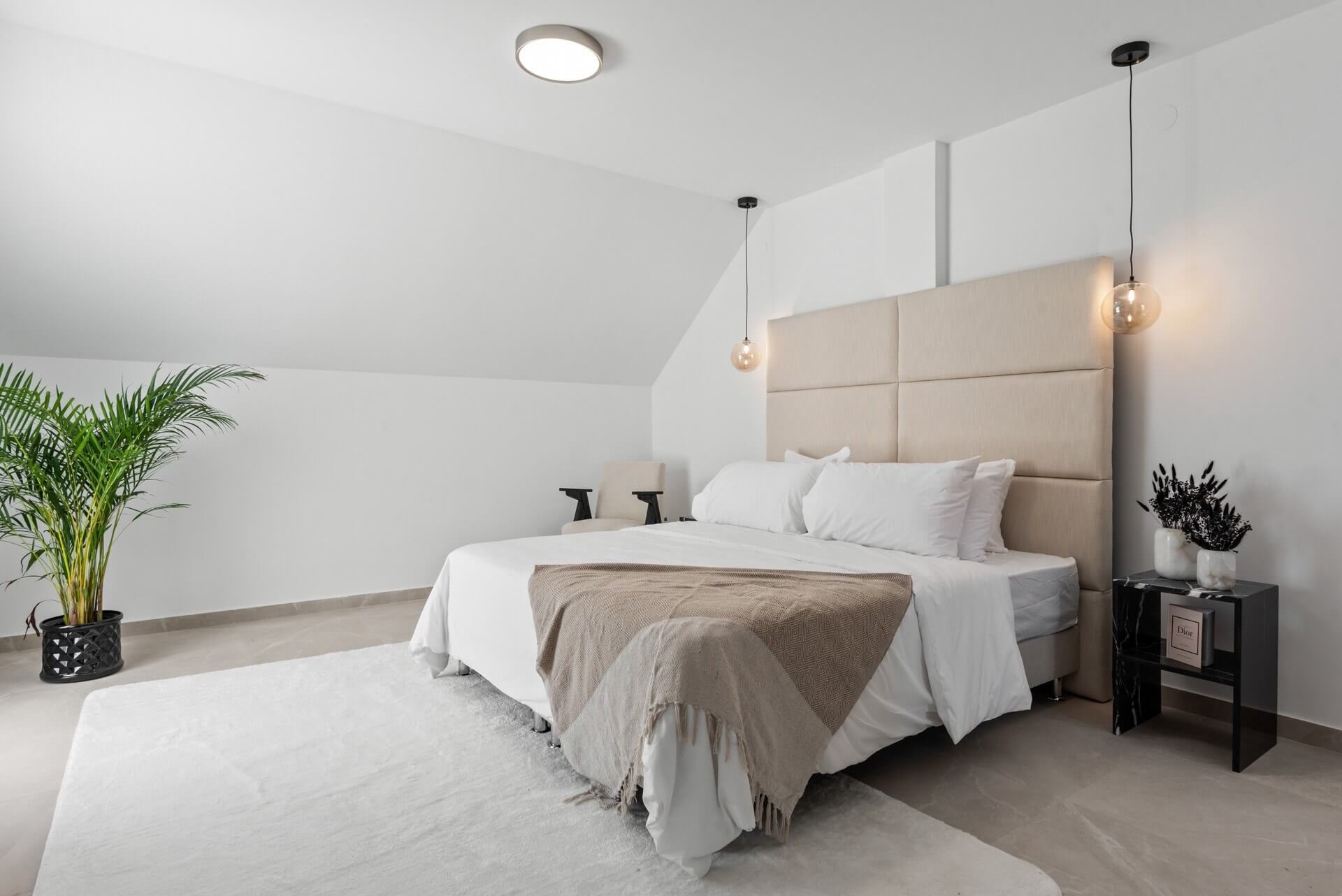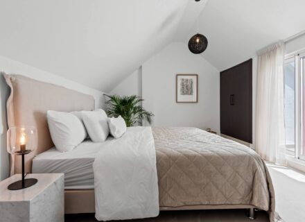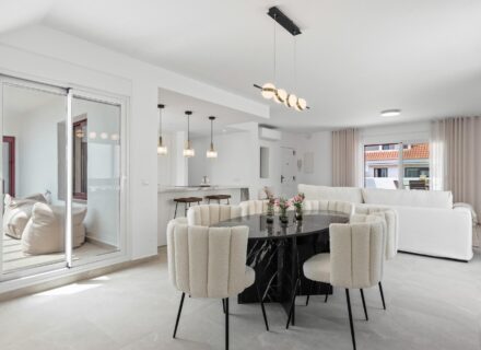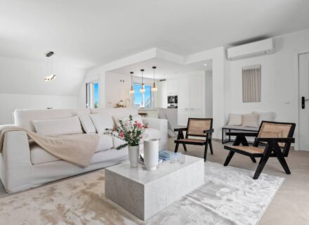 This renovated penthouse spans 215 m² and includes three bedrooms, two bathrooms, and a guest toilet. The main floor features a bright living room with a dining area, an open-plan kitchen, and an east-facing terrace with stunning mountain views. The master bedroom, also located on the main floor, offers direct access to one of the spacious terraces.