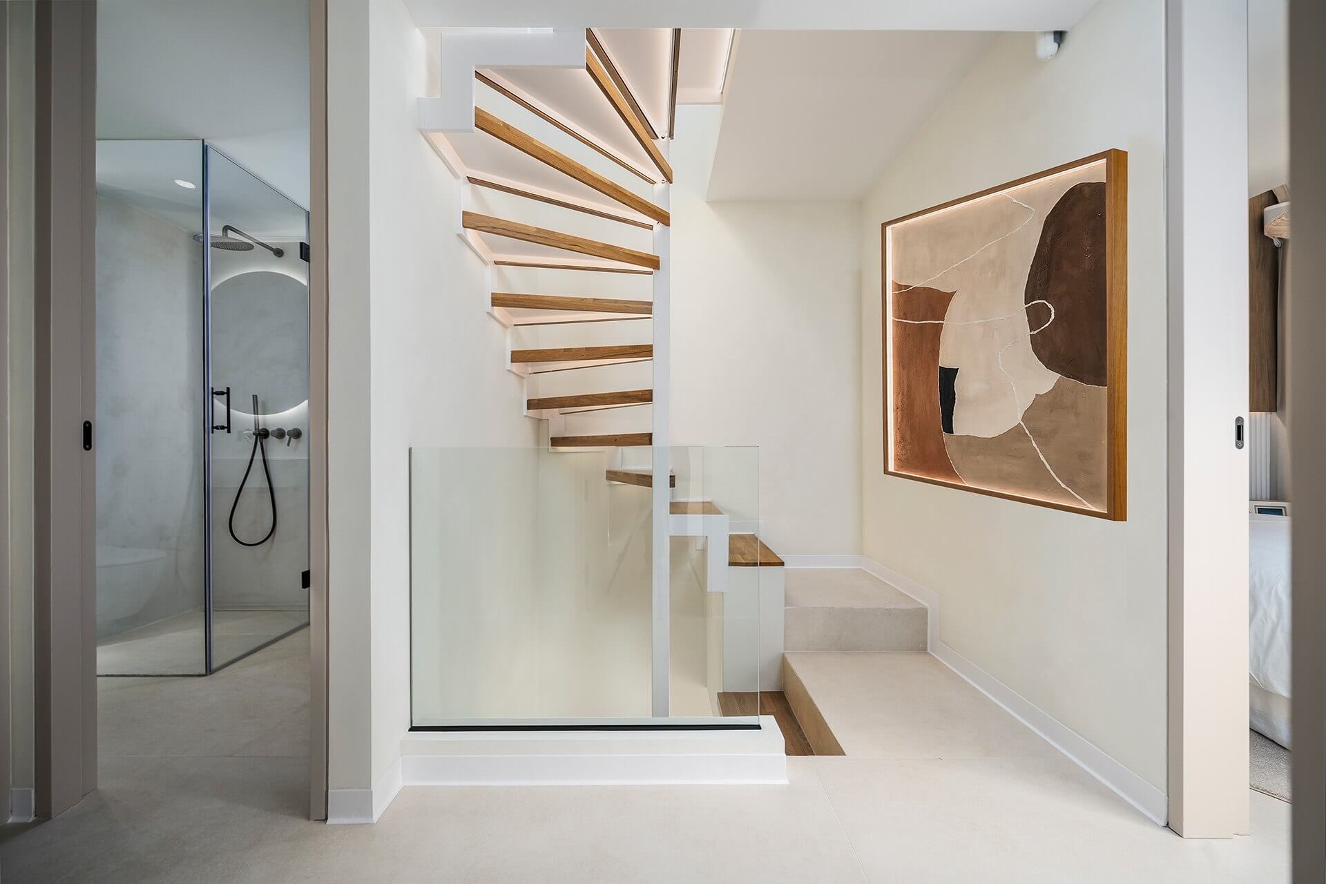 Upon entering the first floor, you are greeted by a spacious living area seamlessly connected to an exquisite kitchen, fully equipped with high-end Smeg appliances. The open-plan design enhances the sense of space and light, creating a perfect environment for both relaxation and entertainment. Step out onto the terrace to take in the breathtaking views of the hills and the sea, a perfect backdrop for your daily life. A convenient guest toilet adds to the comfort of this level.