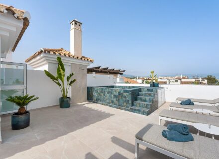 This stunning penthouse in Nueva Andalucia is a masterpiece of modern architecture located in the prized Mirador del Rodeo. First of all, equipped with luxurious amenities, this two-level property offers 187 square meters of total space. Because the residence features an expansive 87-square-meter terrace, it provides breathtaking mountain views from every angle. In addition, the property underwent a complete renovation in early 2024 to ensure the highest quality standards. As a result, this luxury property in Mirador del Rodeo represents the pinnacle of Mediterranean living. Therefore, it is the perfect choice for discerning buyers in 2025.