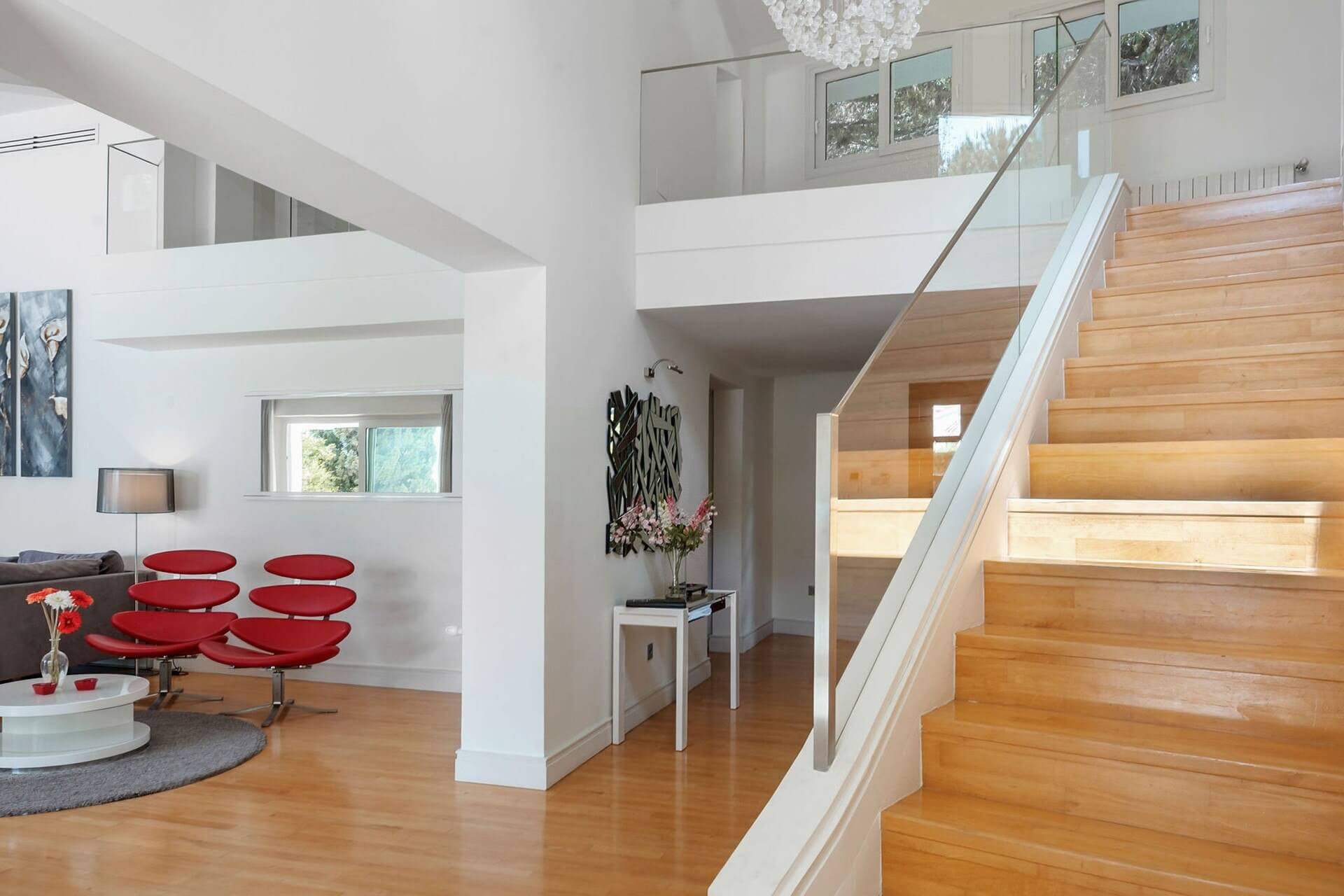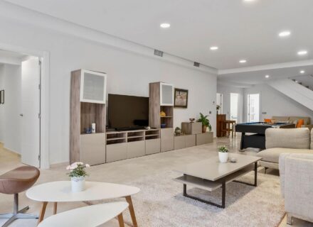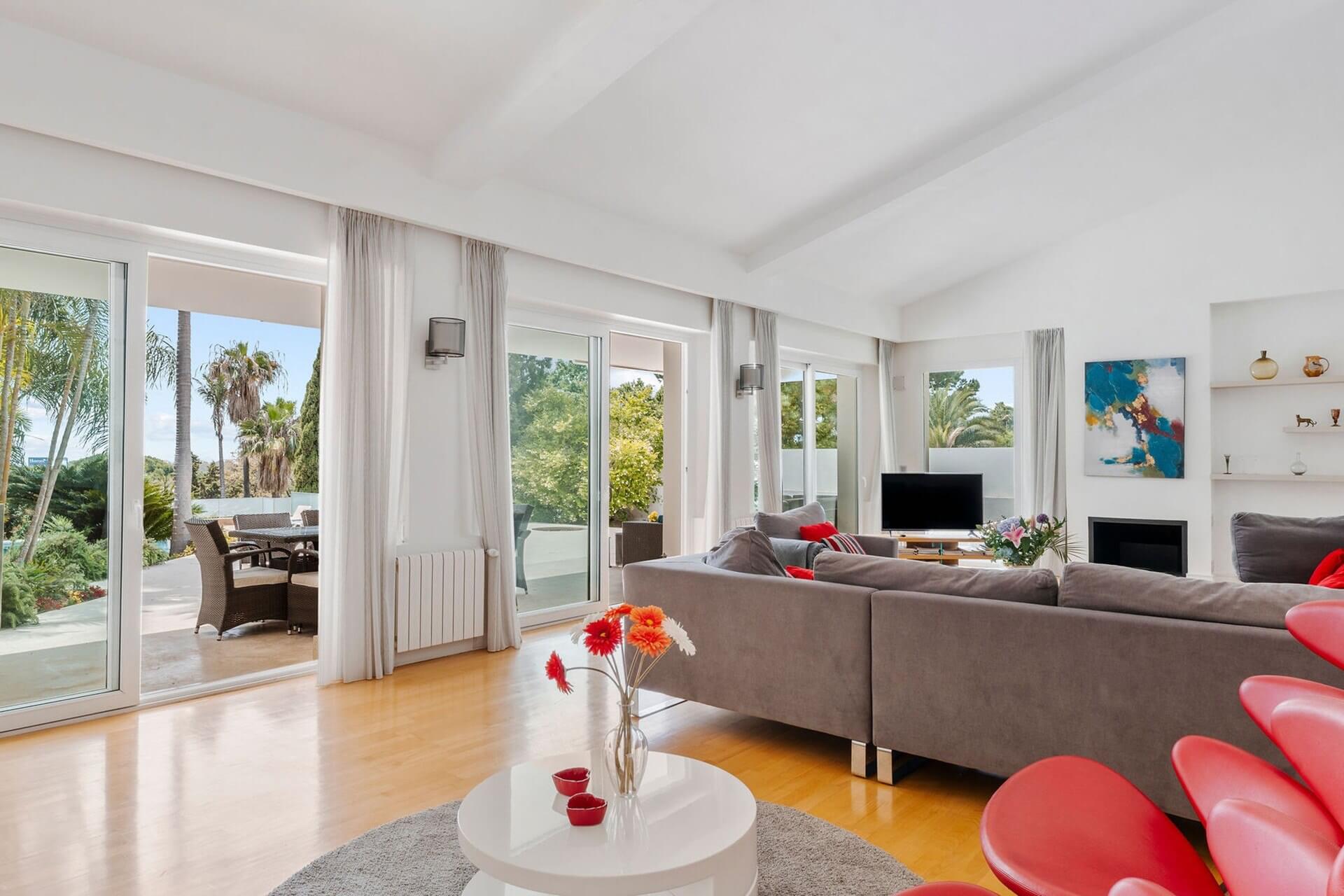 The villa’s interior highlights a modern and contemporary style with Scandinavian influences, featuring ultra-modern interiors, clean lines, and vibrant hues of fuchsia and turquoise. The elegant, designer Nolte kitchen includes white Silestone countertops, white cabinets, integrated ovens, and an American-style fridge-freezer. Blonde wood flooring extends throughout the home, enhancing its Northern European contemporary style.