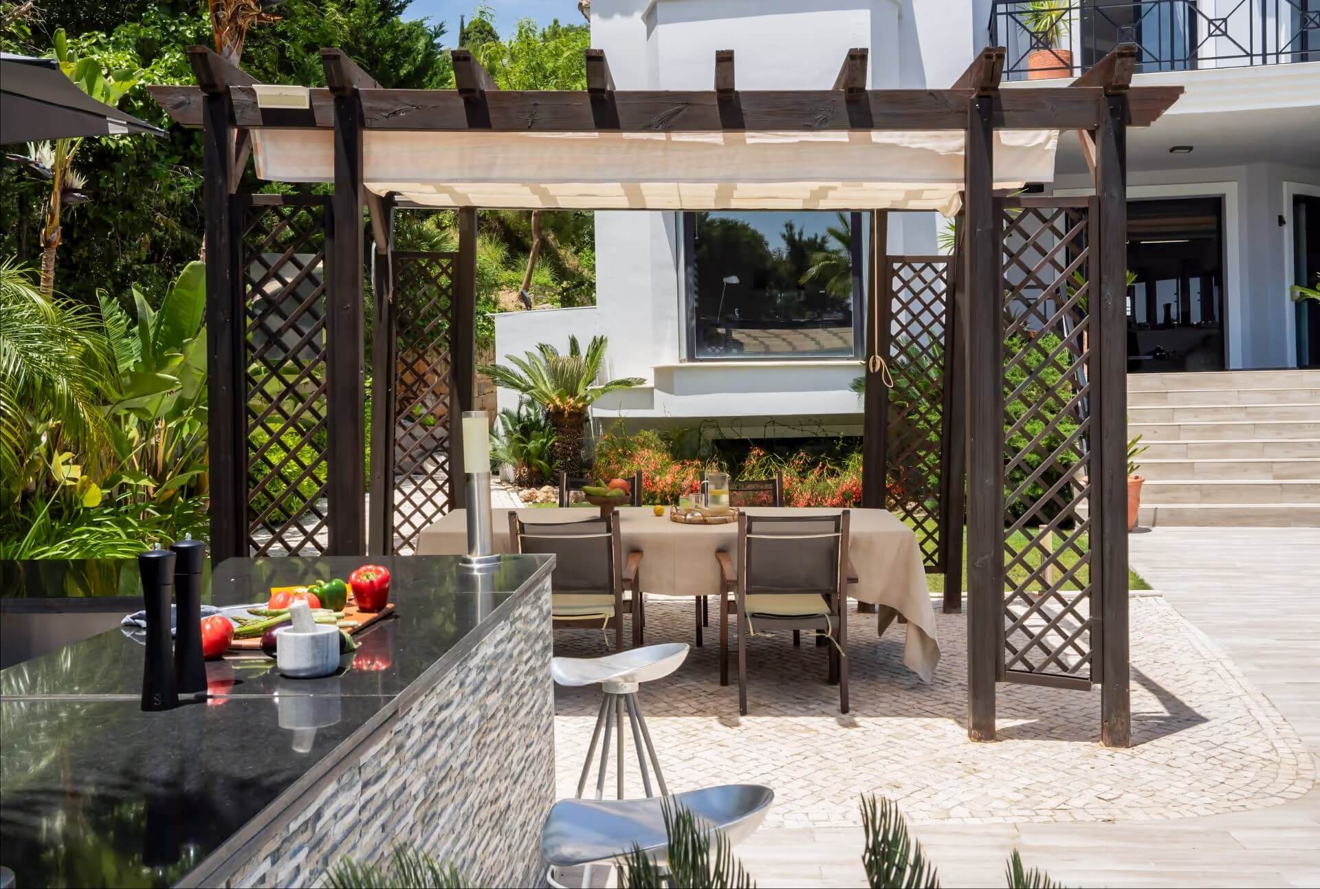 Besides the luxury, the villa also includes a private office and several guest rooms. Specifically, this layout enhances the overall functionality for those who work from home. Furthermore, the garage for two cars ensures secure parking at all times. Because there is an option to extend the garage, the property offers great flexibility for future needs. As a result, this villa for sale in Monte Mayor meets both practical and lifestyle requirements perfectly. So, it is ready to adapt to any family’s changing circumstances.