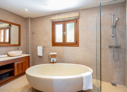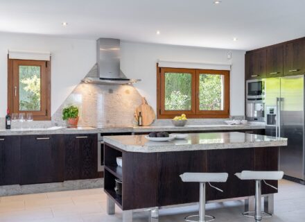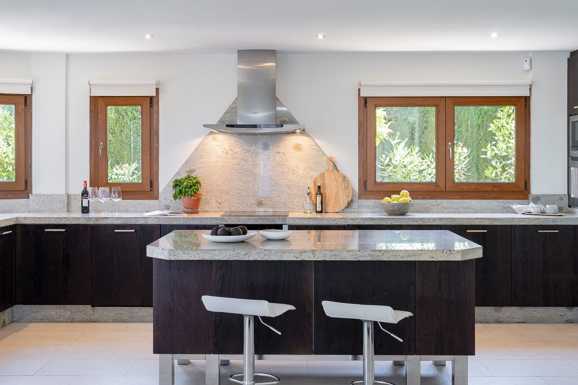 The home features a well-planned layout with a spacious open-plan kitchen and living area. Notably, this design creates an inviting atmosphere for family gatherings and relaxation. The living area seamlessly extends to a large covered terrace. Moreover, the terrace is equipped with retractable glass windows. Therefore, you can enjoy the beautiful Mediterranean surroundings year-round, regardless of the weather. Every corner of this villa in Valle Romano Estepona reflects a commitment to functional luxury.