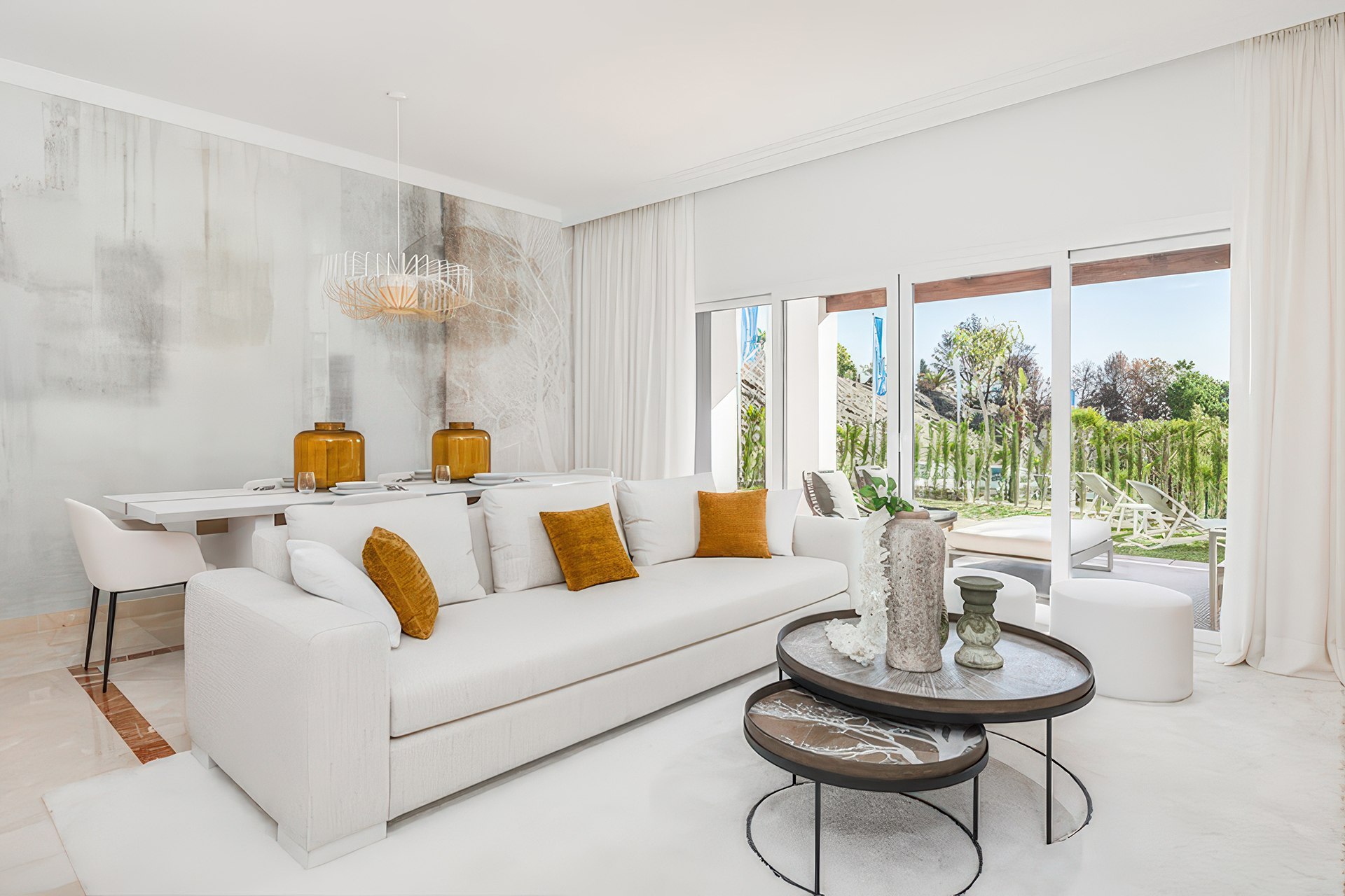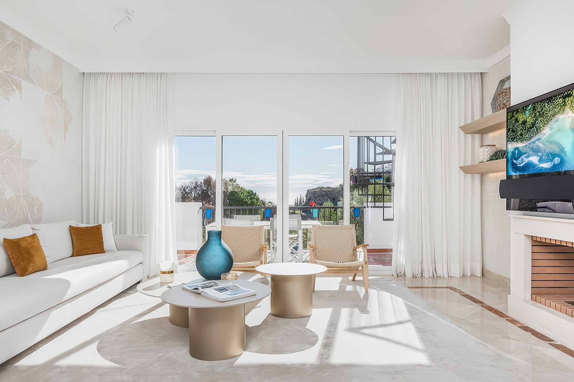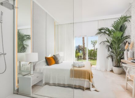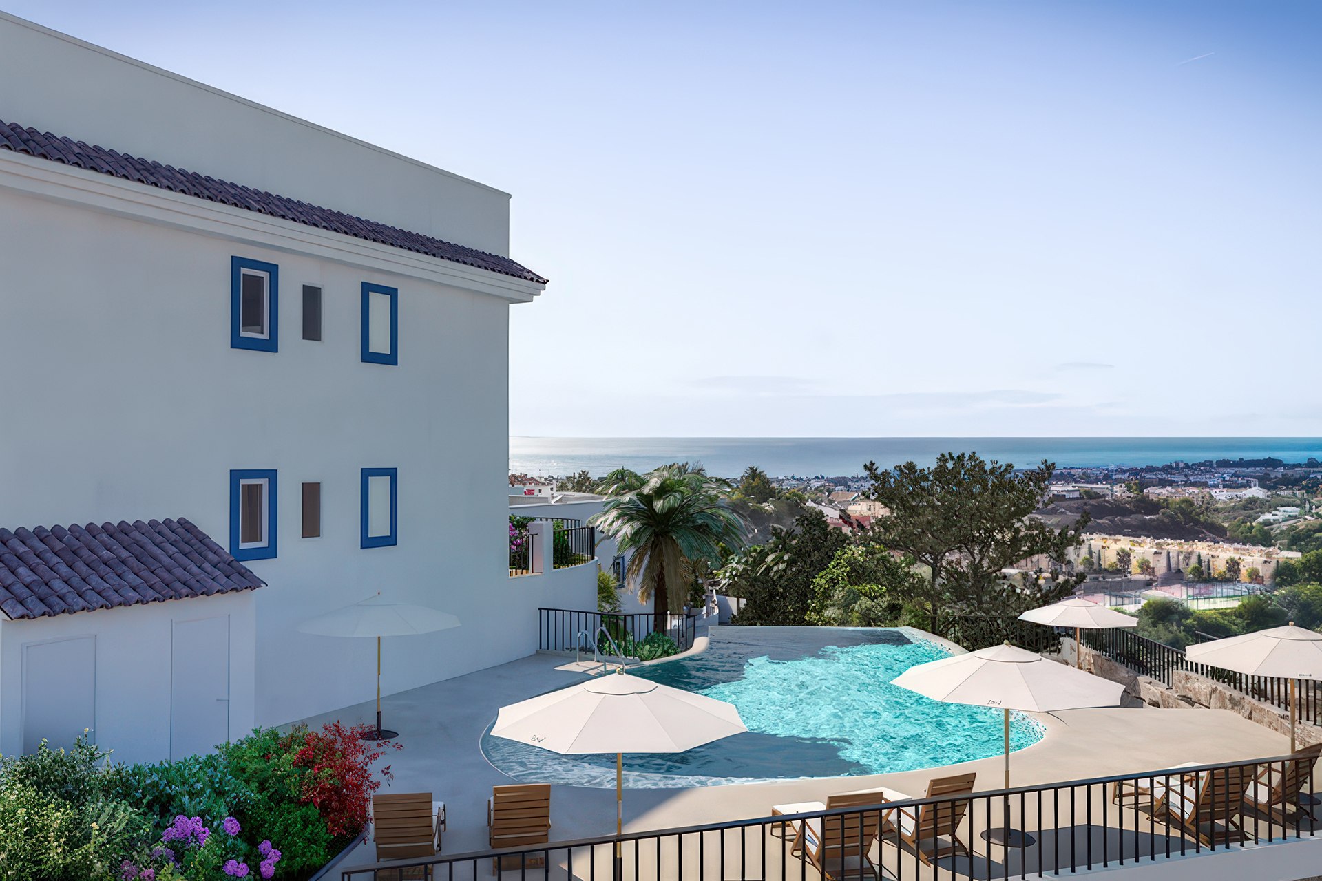 Z wielu oferowanych lokali roztaczają się imponujące widoki na pole golfowe, morze i okolicę. Ta unikalna panorama sprawia, że Apartamenty Paraiso Pueblo Benahavís są jedną z najciekawszych propozycji na Costa del Sol. Duże przeszklenia wpuszczają do wnętrz mnóstwo słońca, co pięknie eksponuje otaczającą zieleń tropikalnych ogrodów. Odległość od morza wynosi około 40 minut spacerem, co zachęca do aktywnego wypoczynku. Jest to zatem idealny balans między ciszą gór a bliskością wybrzeża.