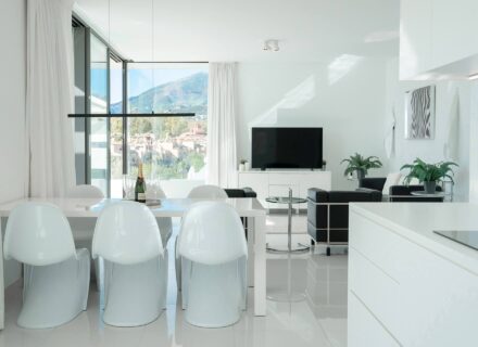 Przekraczając próg, wkraczają Państwo do imponującego salonu. Posiada on okna sięgające od podłogi do sufitu. Dzięki temu naturalne światło wypełnia wnętrze. Doskonale podkreśla to wyrafinowany wystrój apartamentu. Dodatkowo otwarty plan łączy salon, jadalnię i kuchnię. Tworzy to płynne przejście idealne na rodzinne spotkania i przyjęcia.