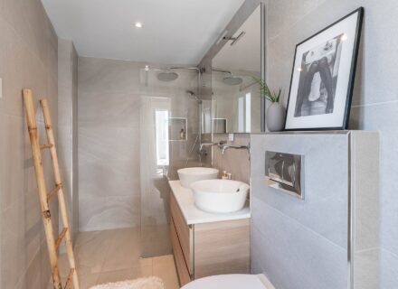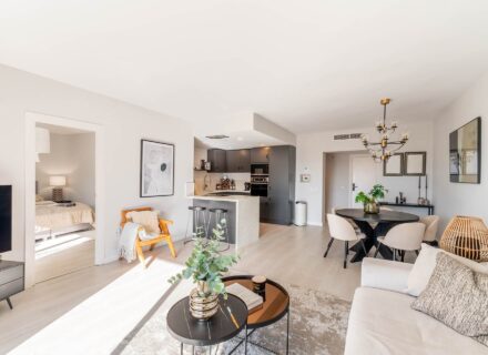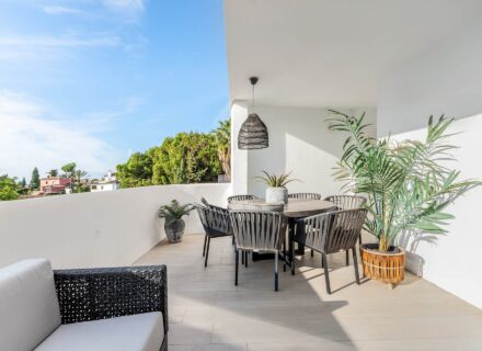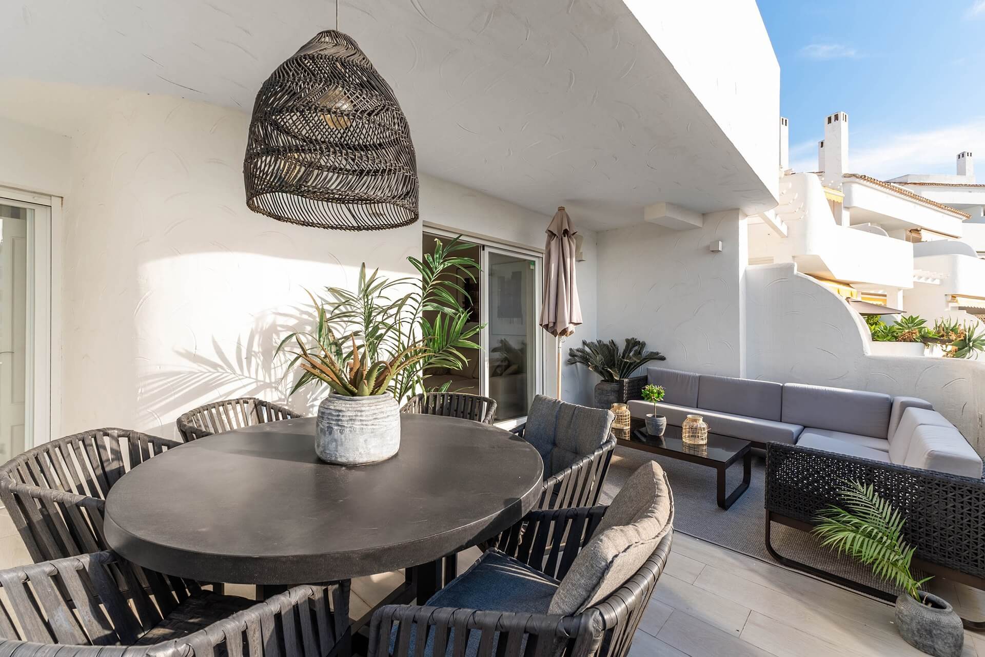 Południowy taras zapewnia doskonałe nasłonecznienie, stwarzając idealne warunki do odpoczynku i organizacji kolacji na świeżym powietrzu. Warto dodać, że to luksusowe mieszkanie oferuje mieszkańcom dostęp do dużego basenu, zadbanych ogrodów oraz siłowni i sauny. Dzięki całodobowej ochronie osiedle zapewnia maksymalne bezpieczeństwo. Dzięki temu Skandynawski styl Nueva Andalucía staje się synonimem miejsca, gdzie design spotyka się z pełnym spokojem ducha.